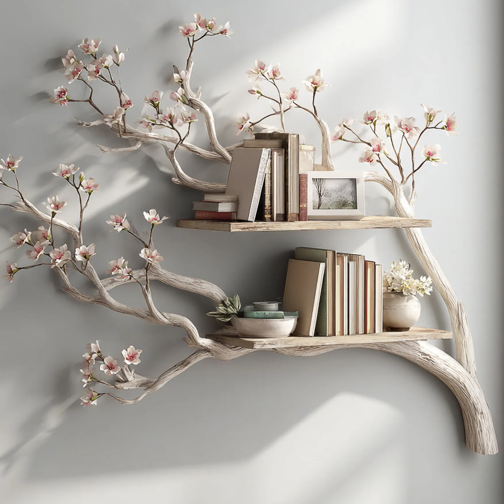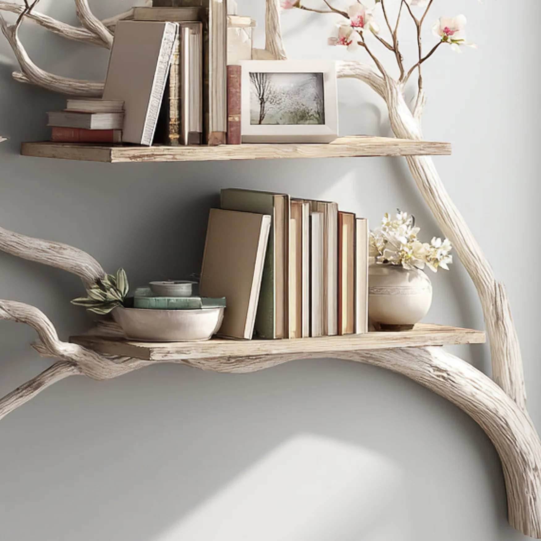Transform your plain walls into a captivating gallery of forest inspired art with the Wooden Tree Bookshelf Wall Mounted. This floating natural wood rack features a stunning organic silhouette inspired by the sprawling limbs of an ancient oak, providing a unique and captivating way to organize your collection of literature and decorative accents. Each branch is strategically angled and reinforced with professional grade hardware to support the weight of multiple volumes while maintaining a lightweight and elegant profile on your wall. Handcrafted from select solid timber, the shelf showcases deep wood grains and a professional matte finish that emphasizes its artisanal origins. The unique layout of the branches allows for a creative distribution of books and small sculptures, making it a perfect conversation starter for living rooms, hallways, or home offices. This eco friendly interior rack not only stores your belongings but also brings a sense of peace and outdoor freshness into your home, celebrating the perfect harmony between structural durability and the soft beauty of natural forms.