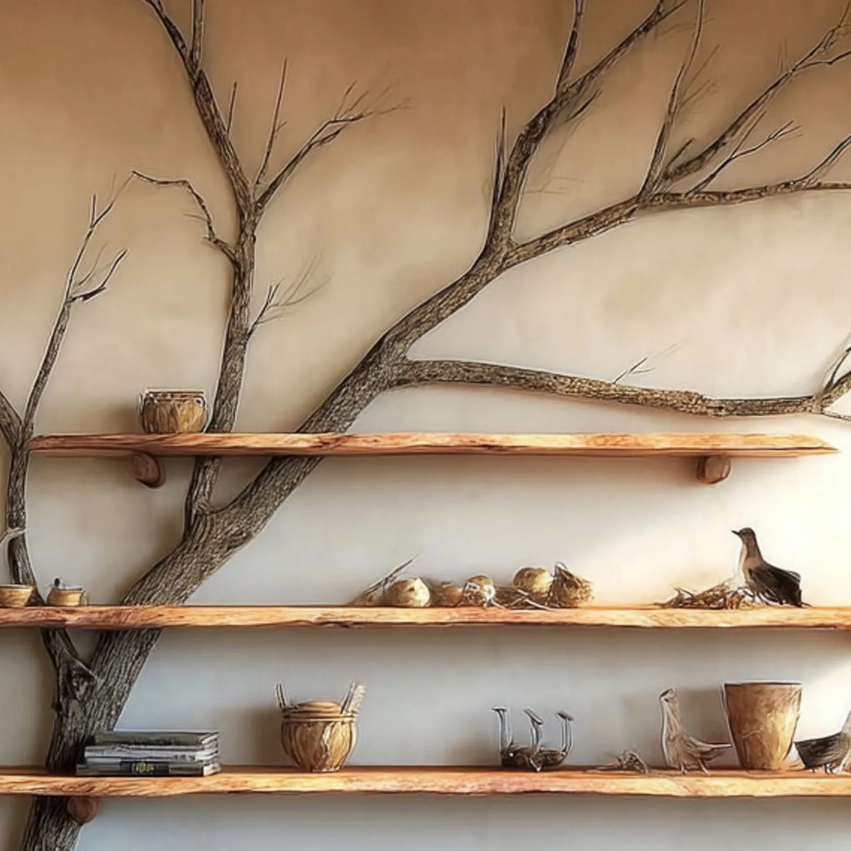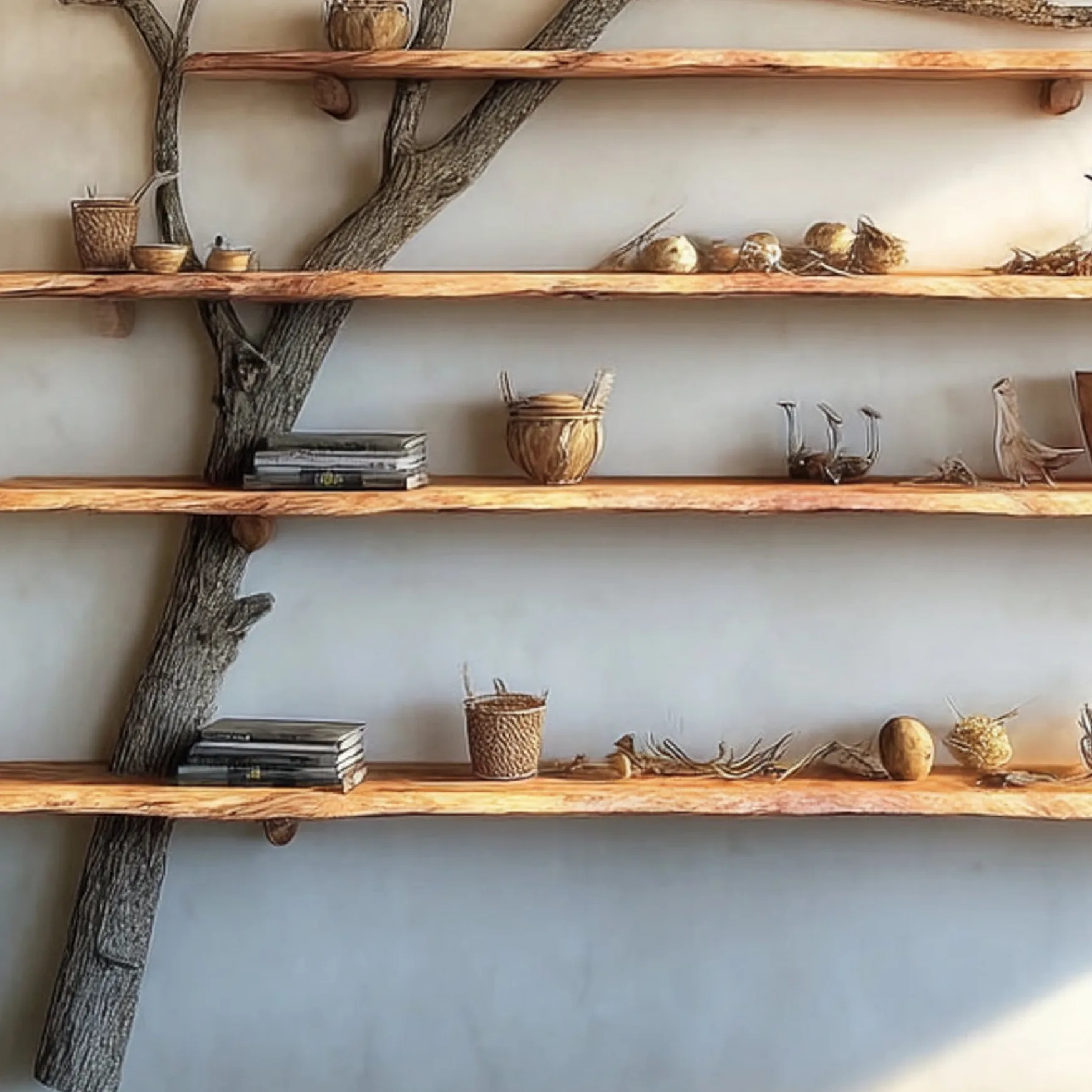 Bring the raw, grounding energy of the forest into your home with the Wooden Tree Trunk Wall Shelf. This solid wood floating textured rack is designed to reflect the sturdy and enduring presence of an ancient tree, offering an organic storage solution for cozy living spaces and rustic home decors. Featuring a central trunk motif and reinforced branch like platforms, this shelving unit provides a heavy duty storage capacity for books, indoor plants, and artisanal accents. Every piece is handcrafted to ensure that the unique character and natural variations of the wood grain are fully celebrated, making each shelf a one of a kind addition to your wall. The robust construction is balanced by a refined polished finish, ensuring that the unit is as durable as it is beautiful. This tree trunk inspired design acts as a bridge between functional furniture and sculptural art, providing a serene and organized atmosphere that honors the beauty of traditional woodworking while maintaining a minimalist floating appearance.